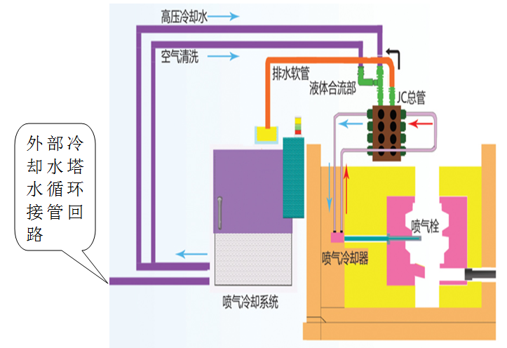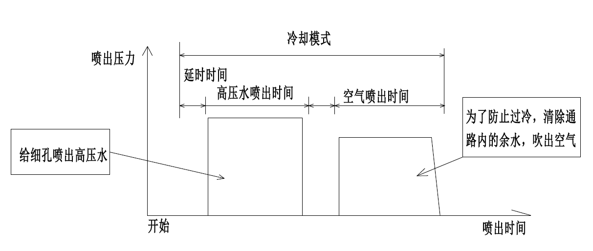 高压喷气冷却点冷系统(以下JECSS)是为了压铸金属模具的细孔冷却而开发的装置。在向细孔通水使金属模具冷却时,细孔中水流的压力,需要超过在内壁上产生的蒸汽膜。另外,小径中心栓的冷却,如果不间断地注入冷却水会导致温度下降过底,可能引起余水等不良效果,因此需要间歇性地注入冷却水,并通过空气将残留在冷却通路内的水清除,JECSS实现了这种冷却。以下是本冷却系统的冷却模式。